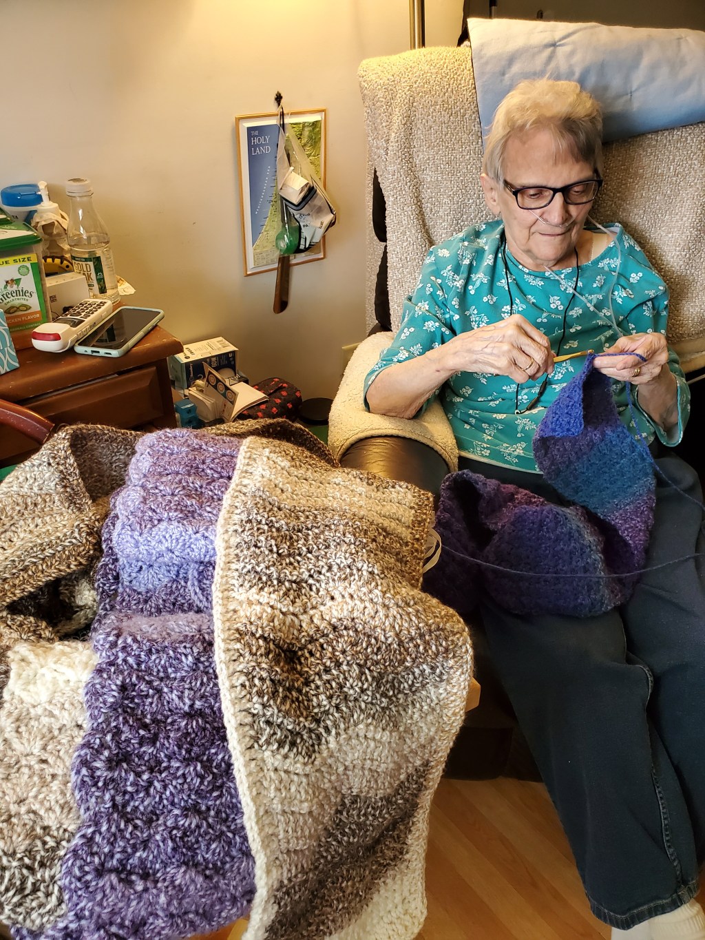 Due to health issues, she is no longer able to give the long hours to the team ministry. Nonetheless, her desire to do for the Lord is unabated. So, she spends hours crocheting scarves for the needy.