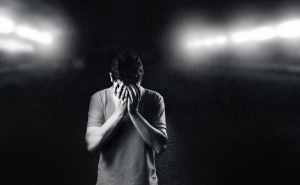monochrome photo of man covering his face