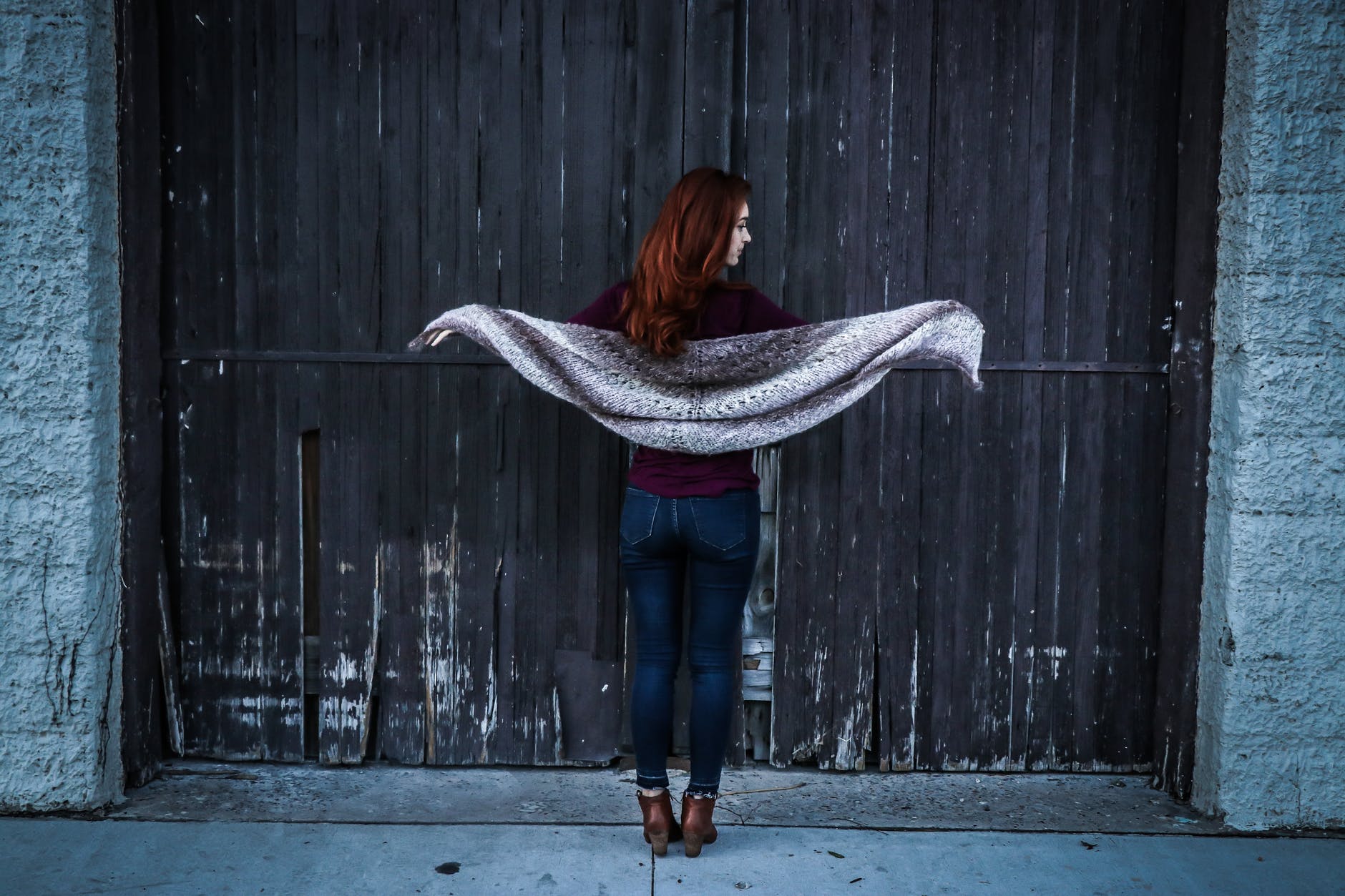 woman holding gray shawl while spreading her arms infront of brown wooden door
